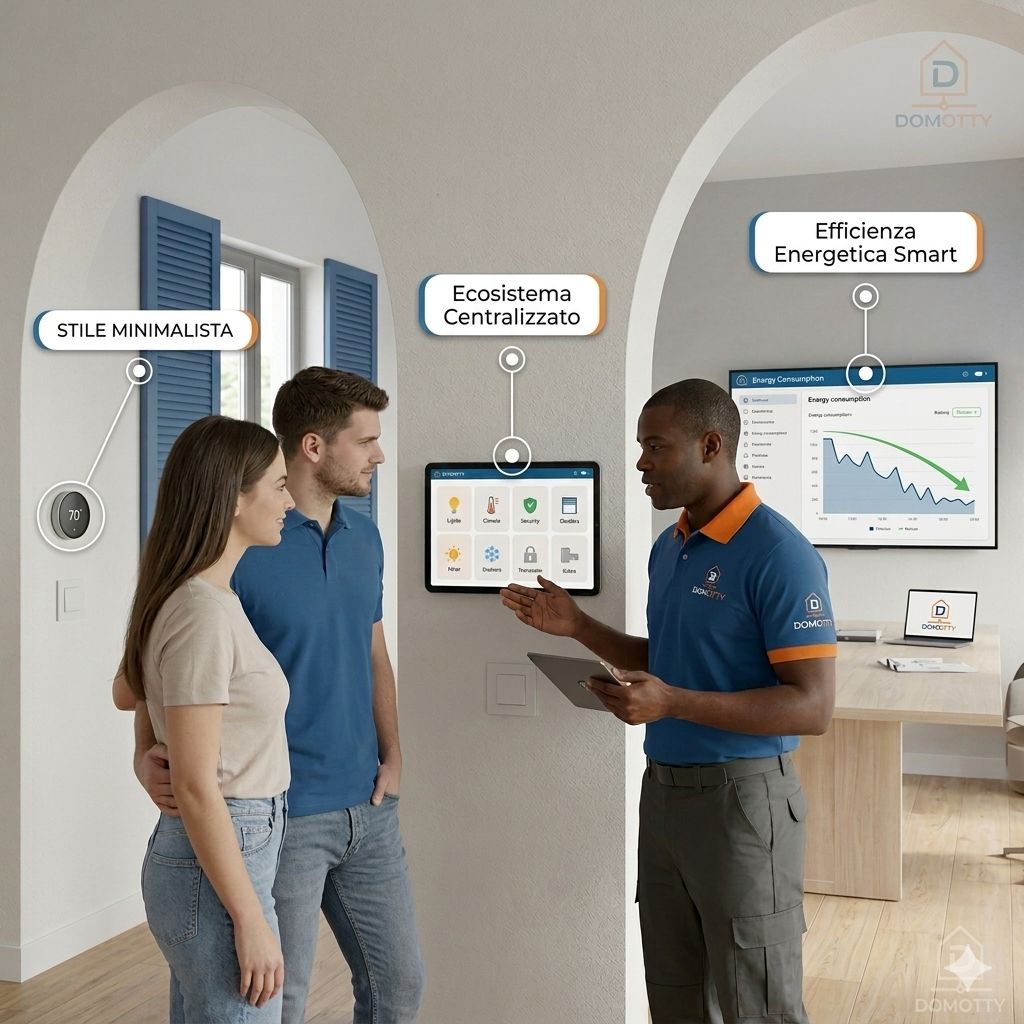 Design Pulito e Raffinato: La tecnologia si fonde con l'arredamento. Dispositivi discreti e interfacce minimaliste che valorizzano l'estetica di ogni ambiente, per uno stile moderno e invisibile.